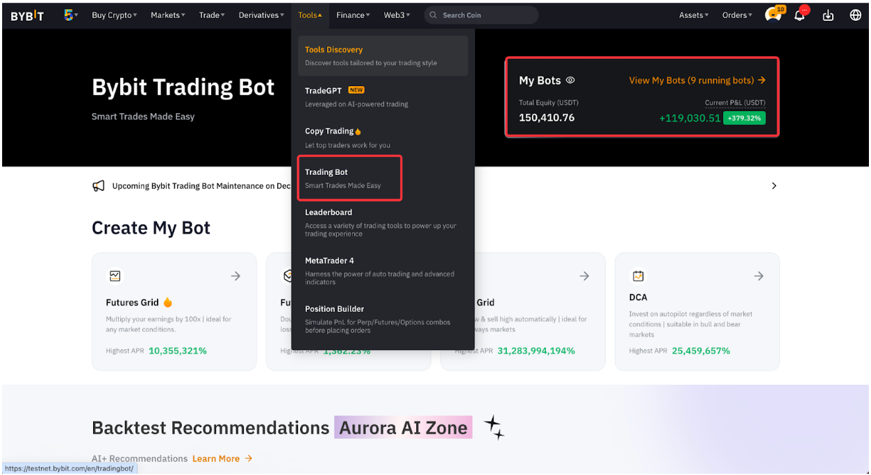 Step 1: Please click on Trade → Trading Bot in the navigation bar to enter the Bybit Trading Bot page.