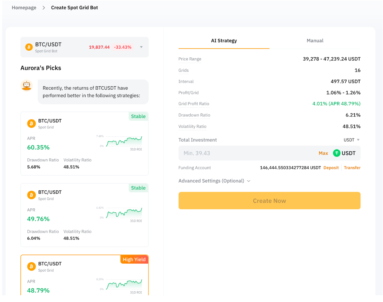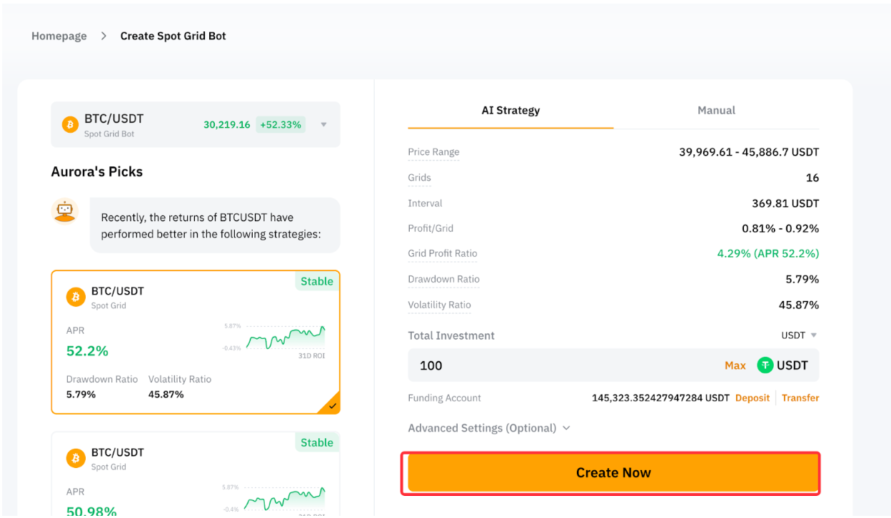 By using AI Strategy, the system will suggest the parameters based on the historical data performance of the Spot trading pair. Alternatively, you can also refer to the suggestion from Aurora’s Picks to create a Spot Grid Bot based on your preferences.