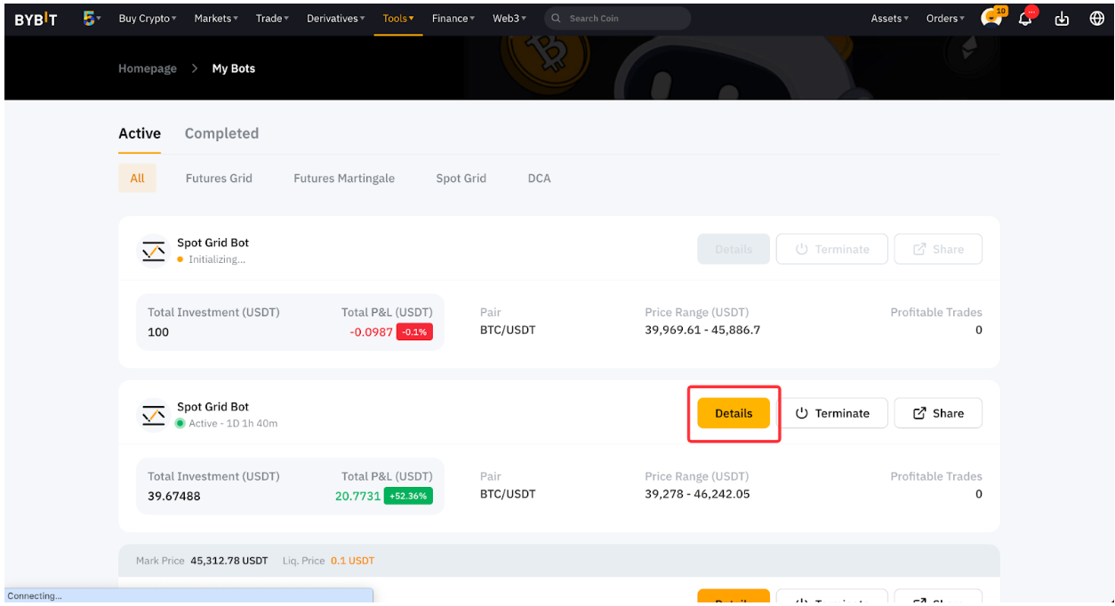 You can click on Details in the upper right corner of the grid bot you wish to view to explore more information, including the current status of your Spot Grid Bot, current orders under the Positions tab, and your order history.