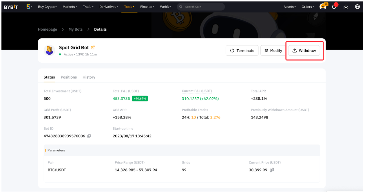 To withdraw your Spot Grid Bot profits, go to your Bots Details and click on Withdraw.