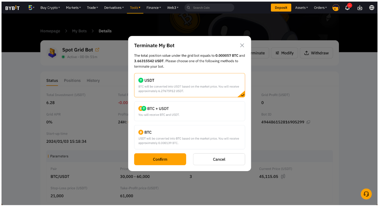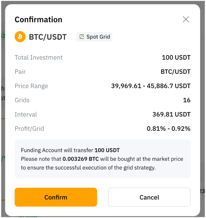 Step 4: Please double-check the grid bot information you’ve created, and then click on Confirm to start trading.