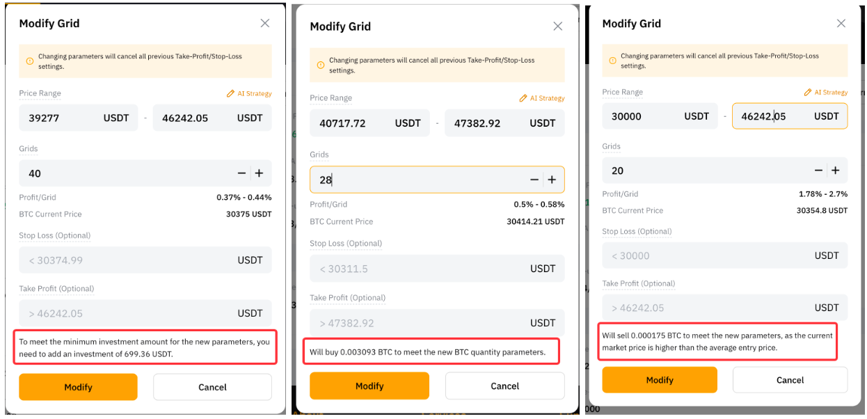 Step 2: Modify your Price Range, Grids, or TP/SL. Additional investment amounts or a modified buy or sell quantity of the base token may be required to meet the new parameters.