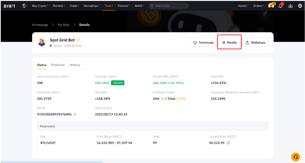 Step 1: Go to your Spot Grid Bot Details page and click on Modify.