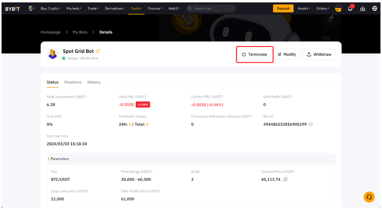 To terminate your Spot Grid Bot, go to your Spot Grid Bot Details page and click on Terminate.
