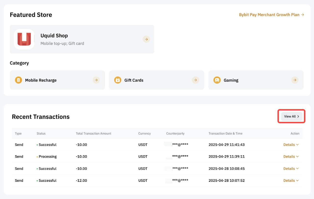 To view your payment history, please head to the Bybit Pay page, scroll to the bottom, and click View All. Alternatively, simply go to Pay Transaction History.