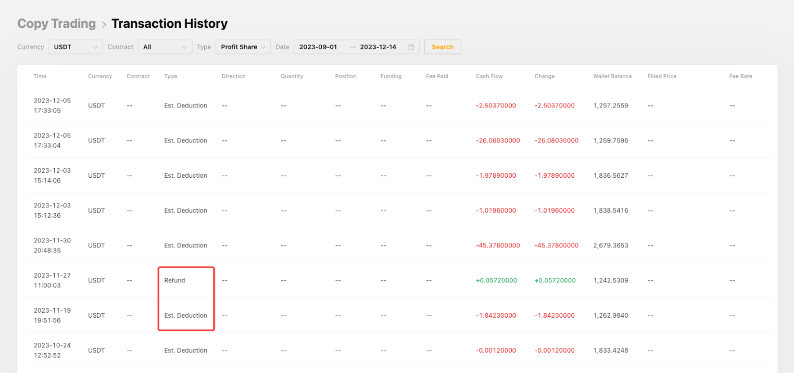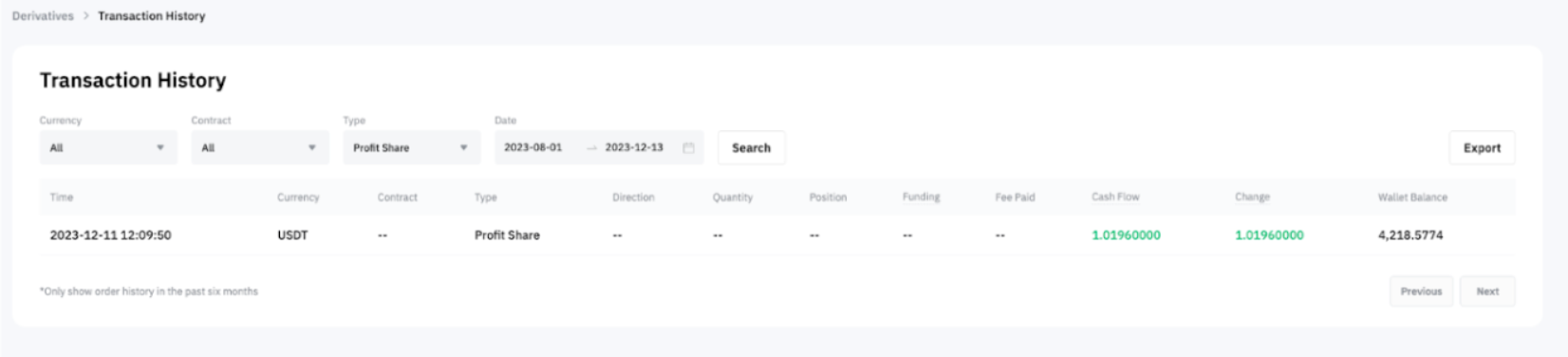 — 交易达人可以从合约账户历史统一交易账户交易日志(已升级至 UTA 的交易达人)查看您的分润记录。
