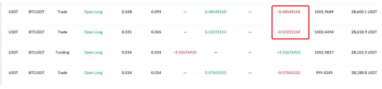 两笔新订单产生的 1.01279322 USDT 的已结建仓费已从可用余额中扣除,将显示在交易历史记录中。