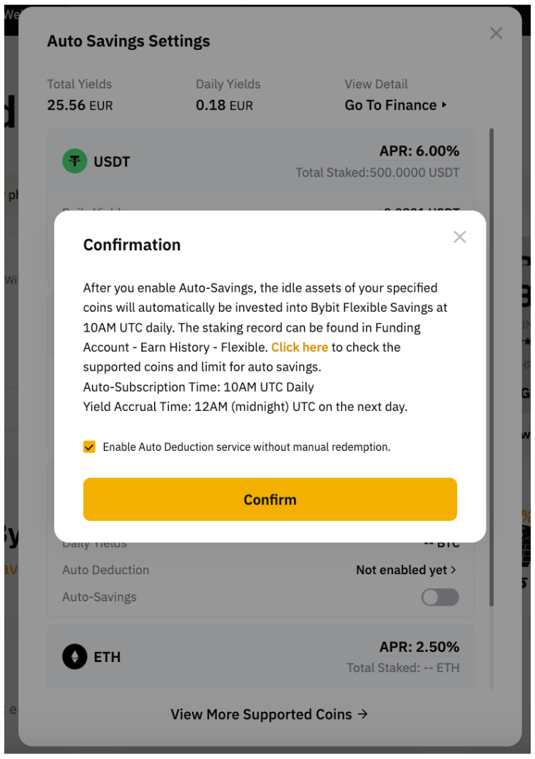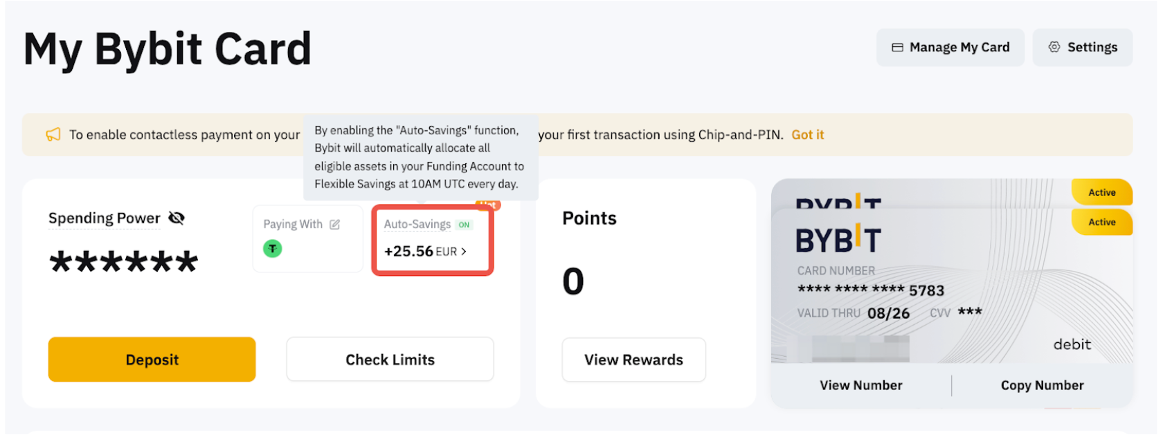 此外,您还可以在 Bybit Card 面板上启用自动扣款功能,通过活期储蓄赚取复利(Bybit 储蓄页面无法直接设置)!