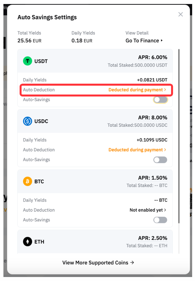 通过启用自动储蓄,您的资金账户中的支付加密资产的可转移余额(显示在付款货币下)将在第二天自动用于订阅灵活储蓄计划。