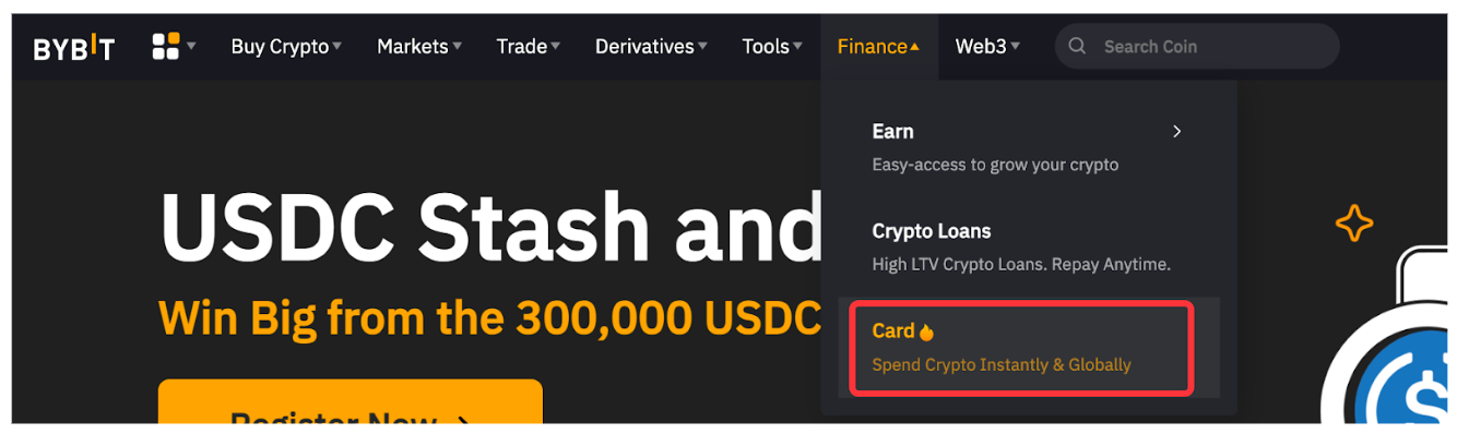 第 1 步: 点击 Bybit 页面导航栏左上角的金融,然后选择卡进入 Bybit Card 页面。