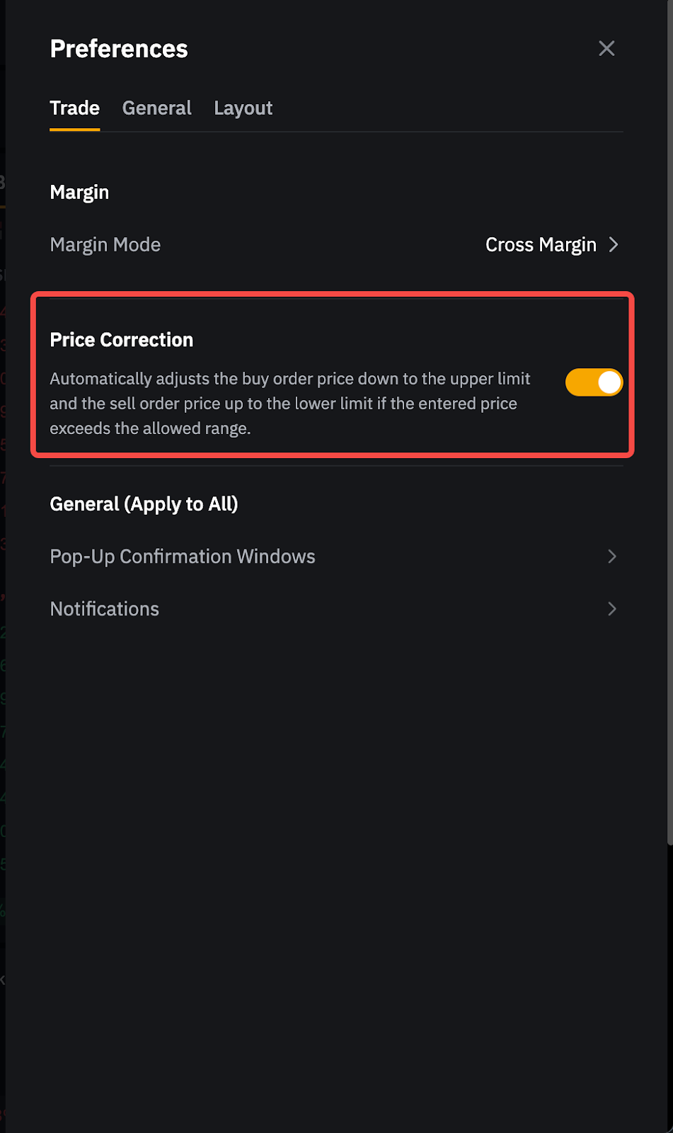 对于限价单:如果购买(或卖出)订单的订单价格高于(或低于)价格限制,则订单将被取消,如果您已禁用价格更正设置(默认),则不会执行。如果您启用了价格更正设置,当输入的价格超过允许范围时,购买(或销售)订单的订单价格将自动下调(或上调)至上限(或下限)。