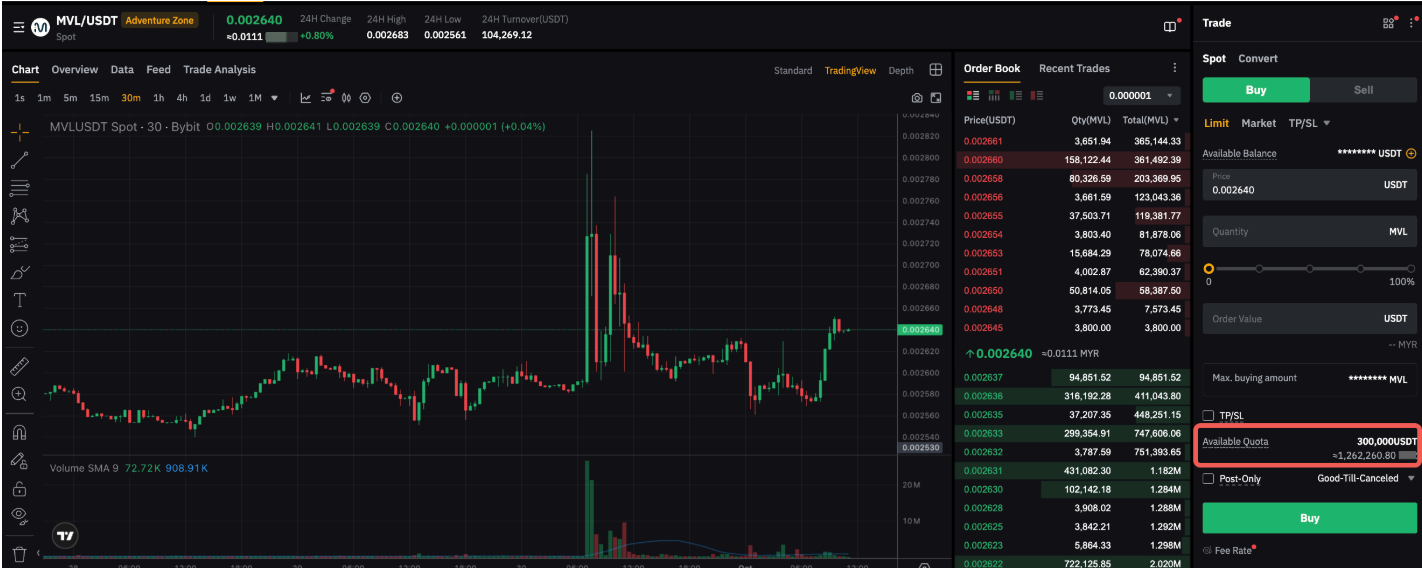 举例说明,MVL 订单限额 300,000 USDT,市场价格为 0.002640。用户可从现货市场购买的最大数量为 113,636,363 MVL (300,000/0.002640)。达到此限额后,仅允许销售订单。在达到限额后,由于存款或价格变化而增加的任何价值不受限制。您可以在现货交易订单窗口中查看订单限额