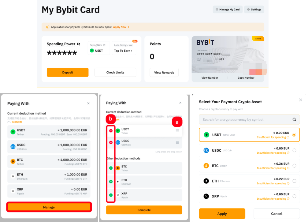 您最多可为 Bybit Card 交易选择 3 种支付加密货币,默认支付优先级为 USDT > USDC >BTC。但是,您可以管理您的支出币种,包括添加、移除或更改卡片面板页面上的订单。
