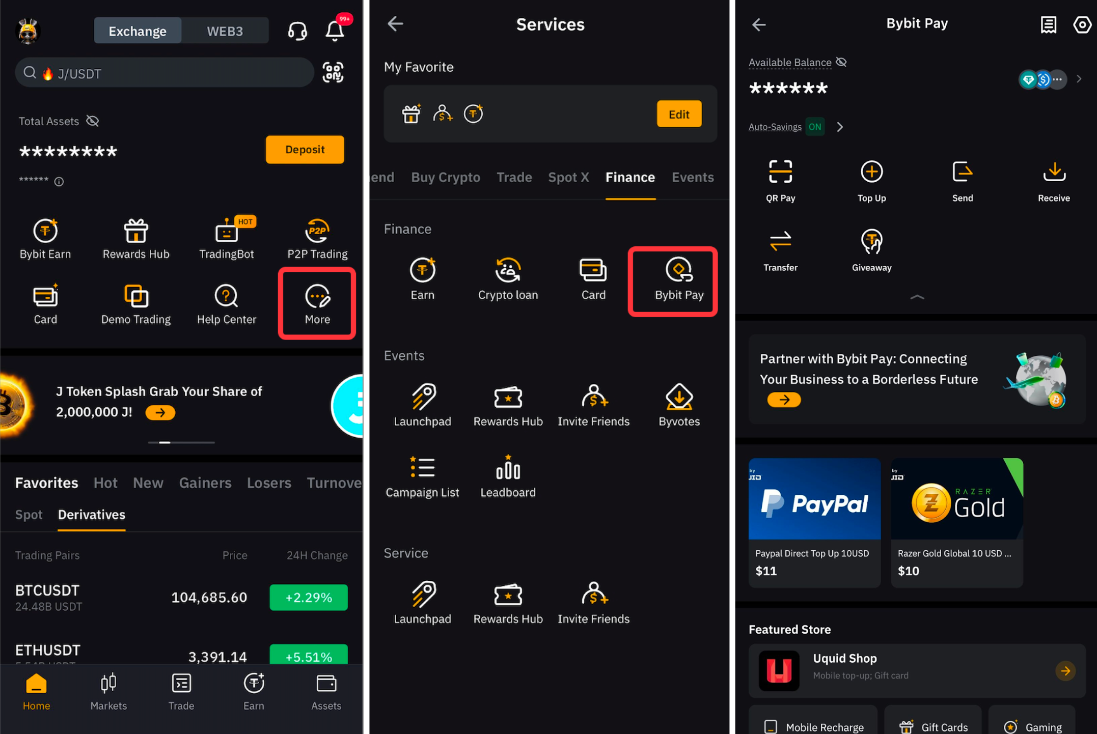 如果您使用 Bybit App,请先启动 Bybit App,然后登录您的账户。点击主页上的“更多”,然后点击 Bybit Pay