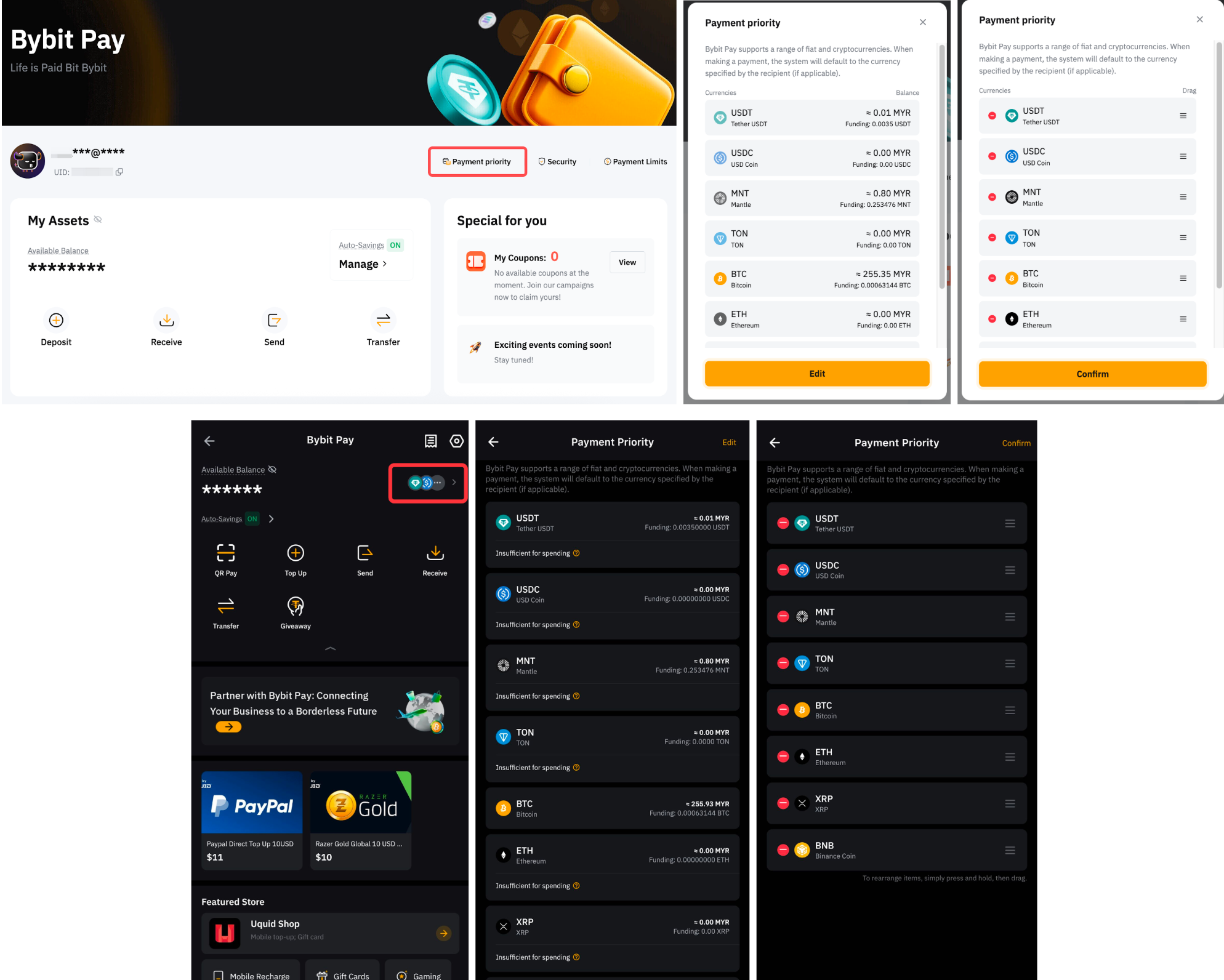 前往 Bybit Pay 页面 → 支付优先级编辑 →点击移除/添加按钮,然后拖动调整顺序。