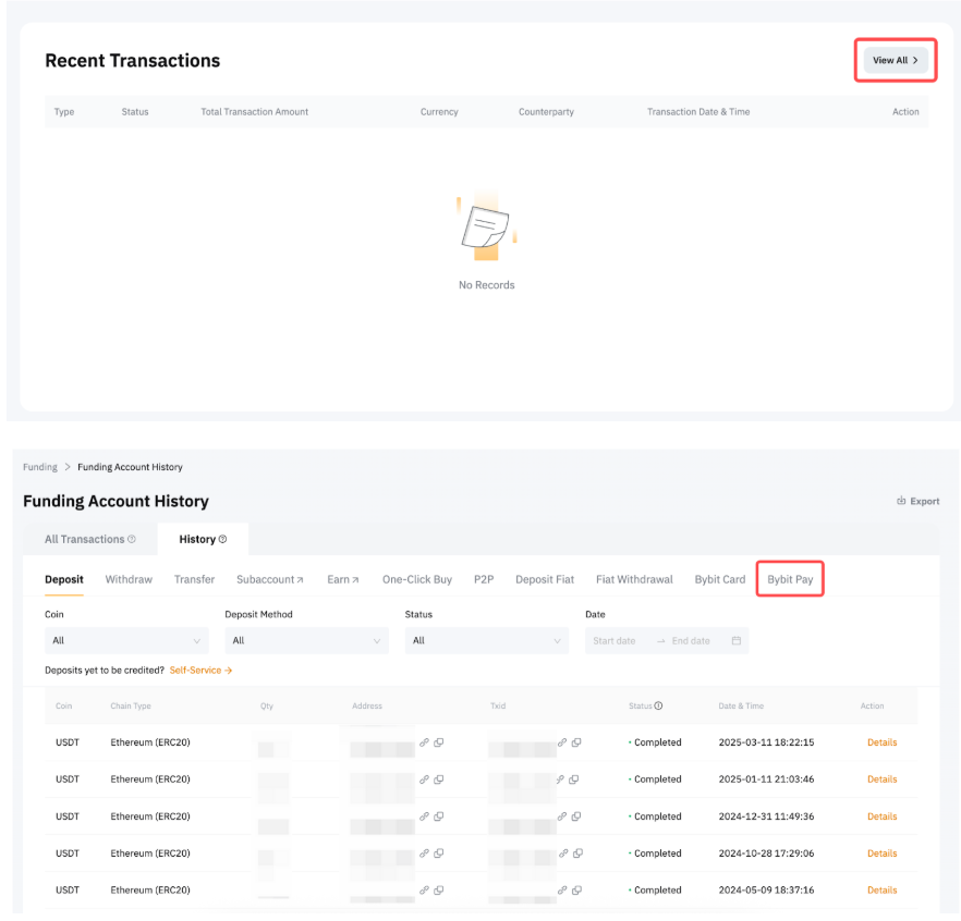 在网站上,前往 Bybit Pay 页面,向下滚动至底部,找到近期交易,然后点击查看全部。或者,您也可以前往资金账户→History → Bybit Pay 找到交易记录