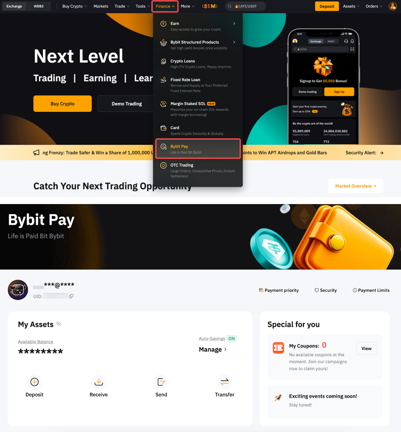 如果您在 Bybit 网站上,请点击金融,然后点击 Bybit Pay