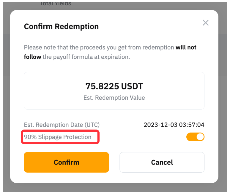 双赢赎回确认窗口上的 90% 滑点保护意味着,如果实际兑换金额低于预估金额的 90%,兑换将会失败。 但是,您的双赢计划将不受影响且有效。 预设情况下启用此设定。