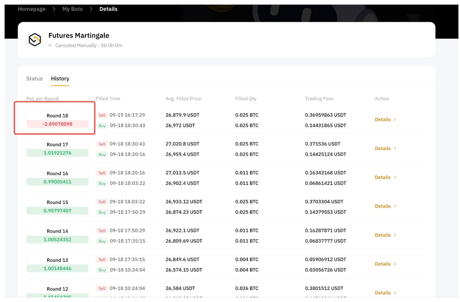 合约马丁格尔机器人运行时,收益将留在机器人内,但不会用作下一轮次交易的保证金。马丁格尔机器人策略终止后,资金将从用户的交易机器人账户自动划转至资金账户。