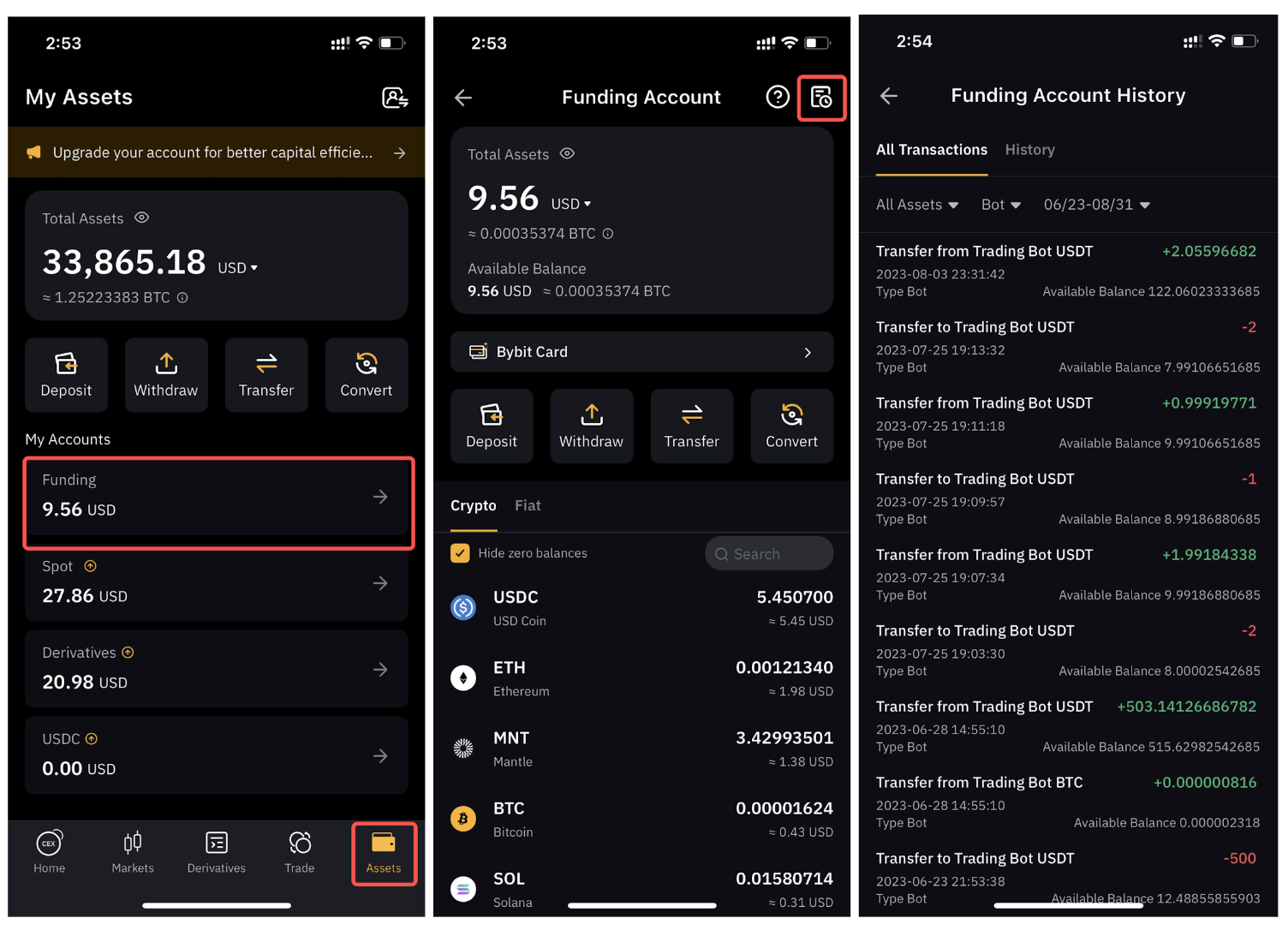 在 Bybit App 端,前往资产 → 资金账户,点击右上角的资金记录图标,即可在资金账户资金记录中查看与交易机器人的互转记录。