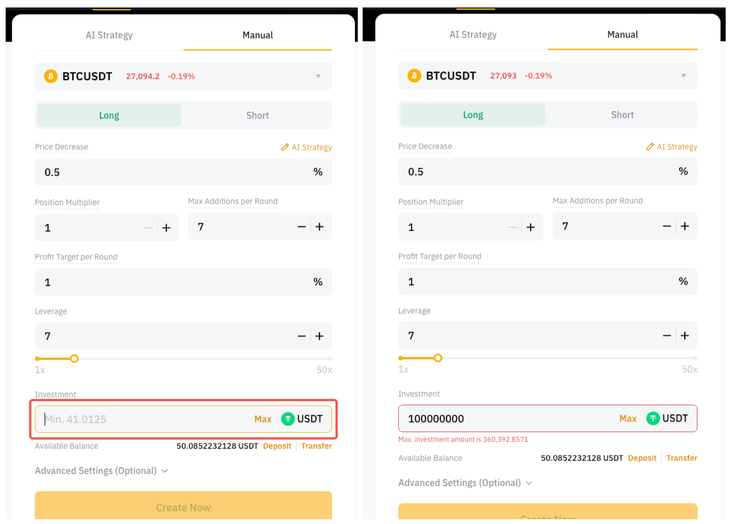 - 个人资金账户内的 USDT 资产余额不足,未达到合约马丁格尔机器人策略的最低投资额要求