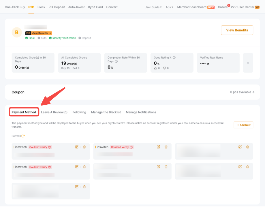 您可以在付款方式页面查看验证状态。要访问此页面,请转到 P2P 用户中心付款方式