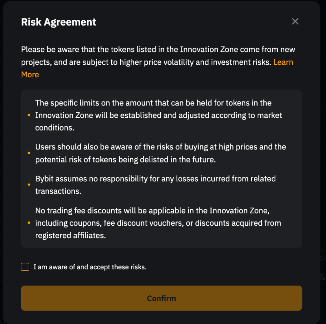 请注意,对于在创新区交易而造成的任何损失,Bybit 概不负责。建议用户仔细评估所有项目详情和风险,根据自身财务状况和风险承受能力,谨慎决定是否进行投资。