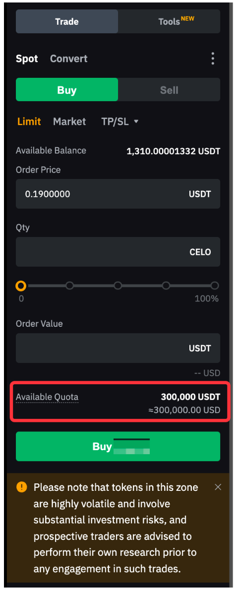 该信息可于交易页面上的“可用额度”部分查看。例如,若代币 ABC 的可用额度为 300,000 USDT,单价为 0.5 USDT,则您至多可持有 600,000 ABC(计算公式为 300,000 USDT ÷ 0.5 USDT = 600,000)。