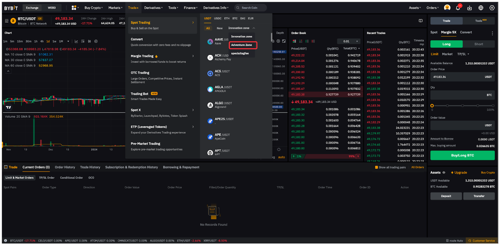 若要访问风险投资区及其交易对,只需点击交易 → 币币交易,在下拉选单中选择风险投资区。