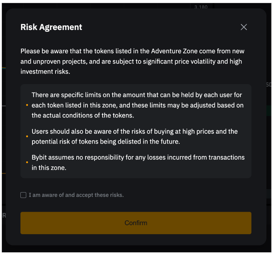 请注意,对于由风险投资区内的交易造成的任何损失,Bybit 概不负责。建议您仔细评估所有项目详情和风险,根据自身财务状况和风险承受能力,审慎做出投资决策。