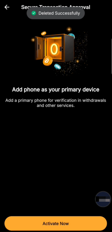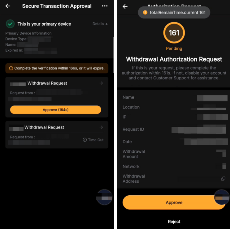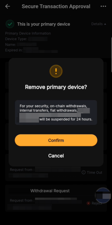 激活该功能后,需指定一部手机作为您的主设备,其余设备将自动列为备用设备。当通过备用设备或 Bybit 官网发起提币或其他交易时,系统将向您主设备上的 Bybit App 发送验证申请。您可以选择批准该交易,若交易看上去很可疑,您也可以选择拒绝该交易。