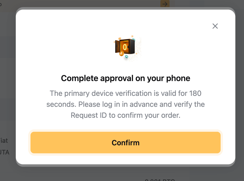 第 1 步:完成主设备设置后,当您尝试通过备用设备或从 Bybit 官网发起交易时,系统将提示您进行主设备验证或请通过手机完成审批。