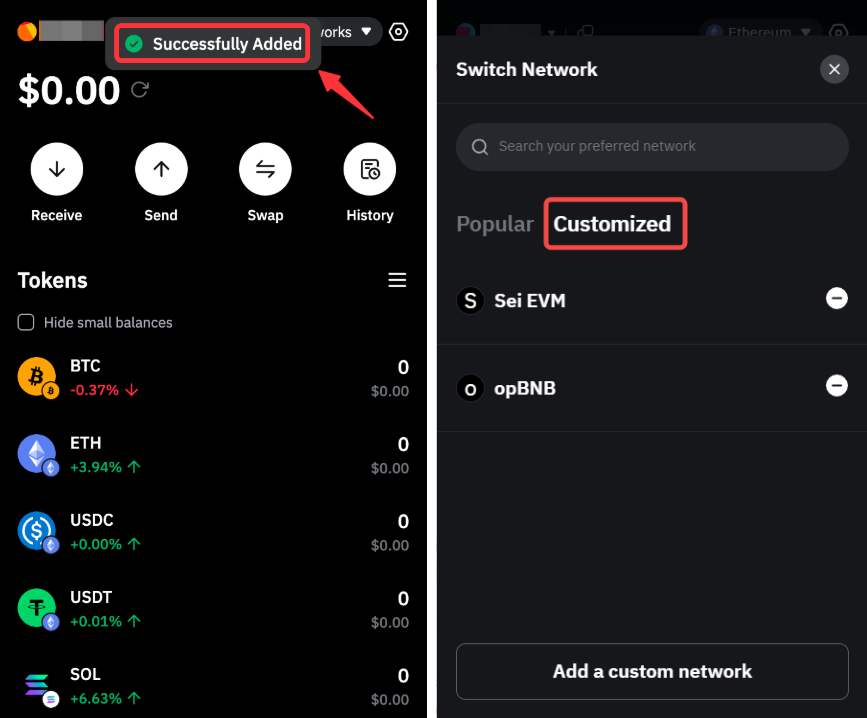 网络将成功添加至您的 Bybit 钱包。您可以在网络页面的自定义选项卡中查看所有自定义网络。