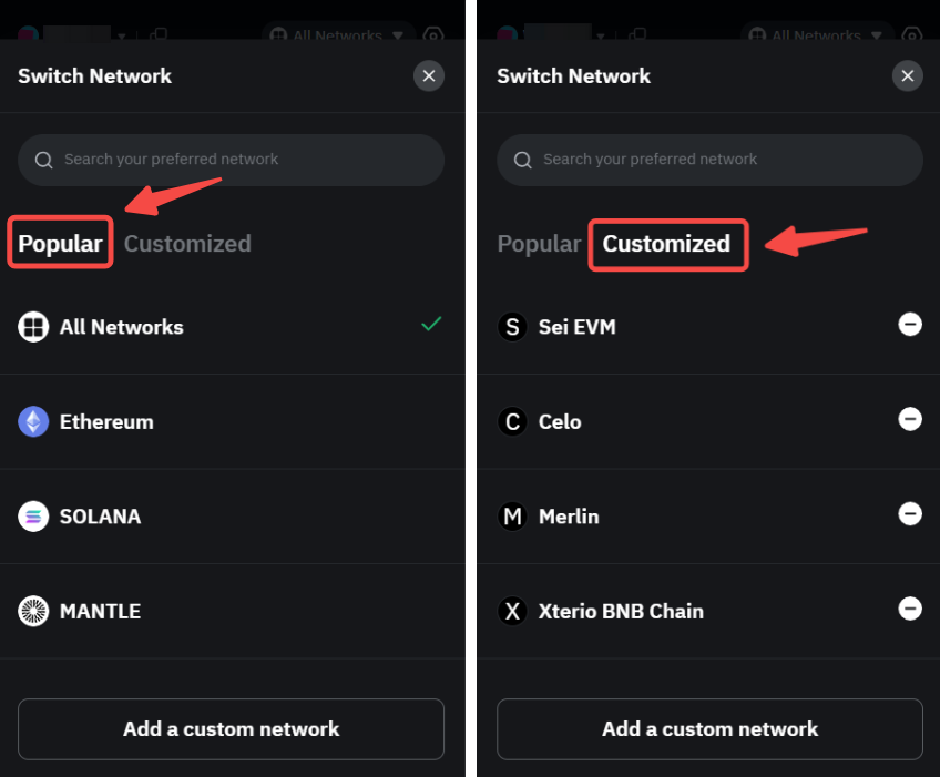 第 2 步:找到您感兴趣的自定义网络,然后点击该网络切换到该网络。
