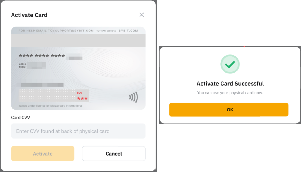 第 5 步:输入 Bybit 实体卡背面的 3 位数 CVV,然后点击激活,即可使用 Bybit 实体卡!如果您尚未提供手机号码和账单地址,您需要在输入 CVV 前输入相关信息。