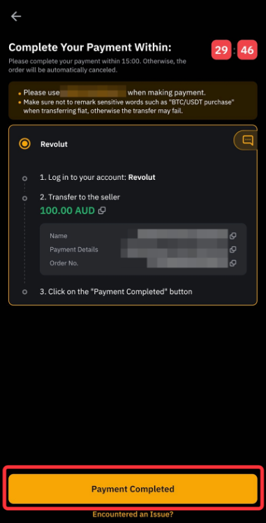 根据您选择的支付方式,以法币支付。确保使用正确的方式将正确的金额划转至正确的账户。完成此操作后,点击“付款完成”按钮通知卖家。