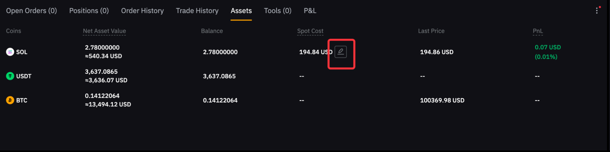第 1 步:滑动至页面底部的资产,点击现货成本价数值旁边的编辑图标。