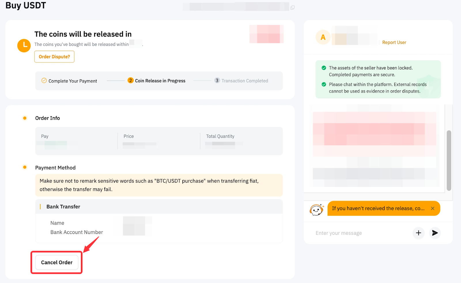 当订单状态为待支付款项或正在释放货币时,买方可以取消订单。