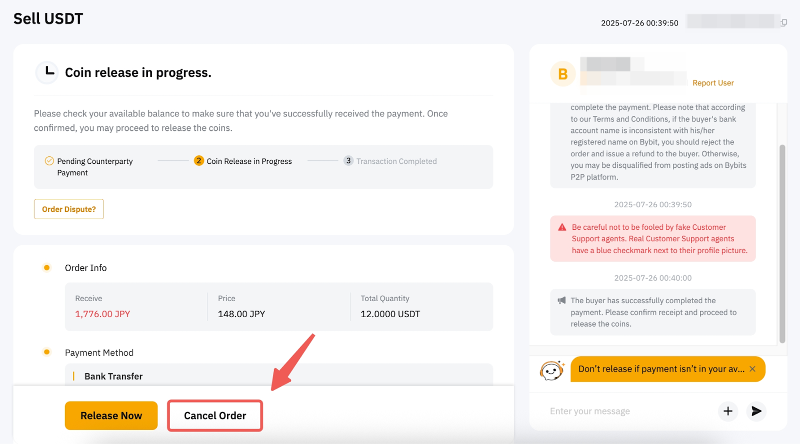 第 1 步:点击 P2P 订单页面底部的取消订单。