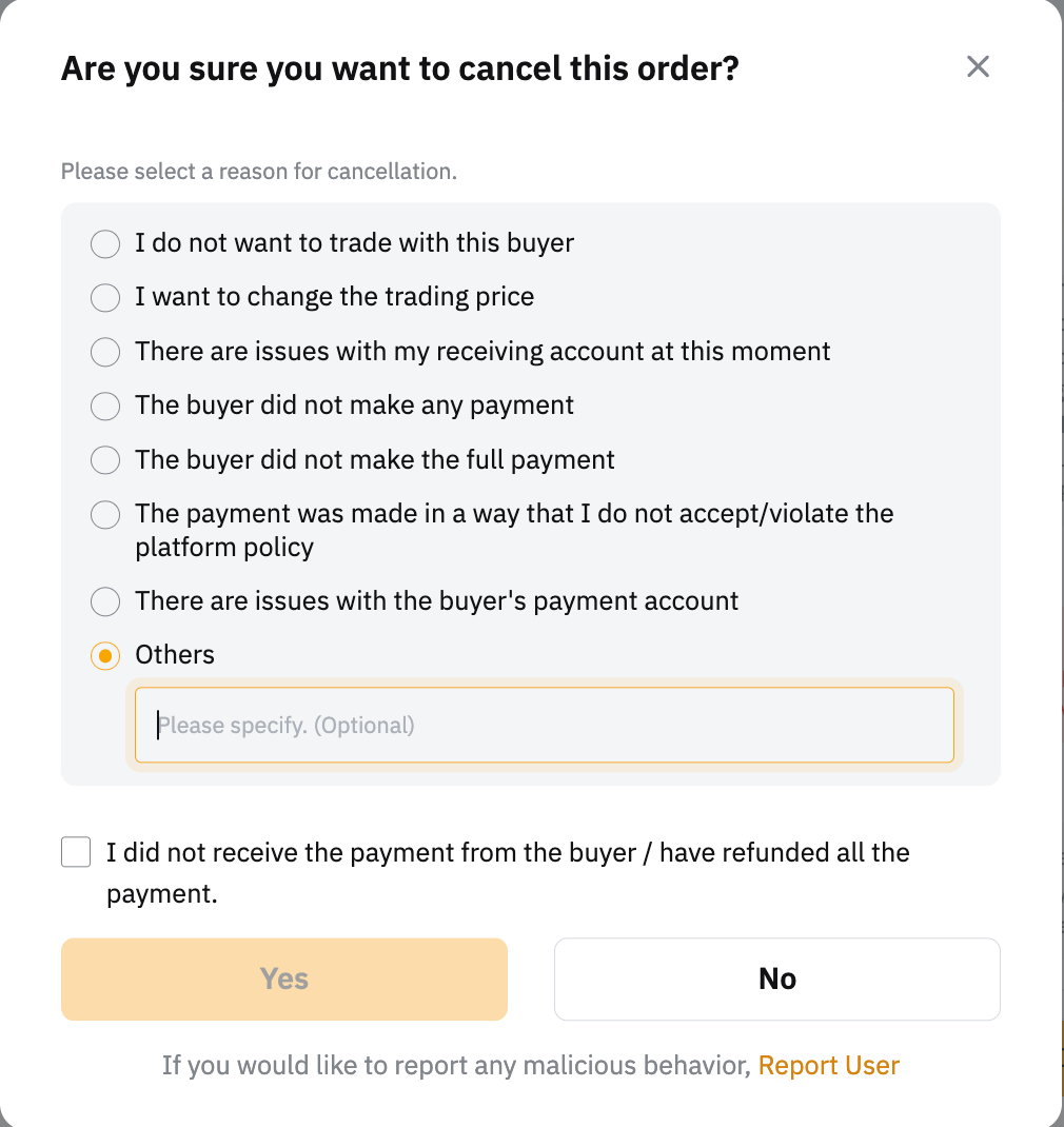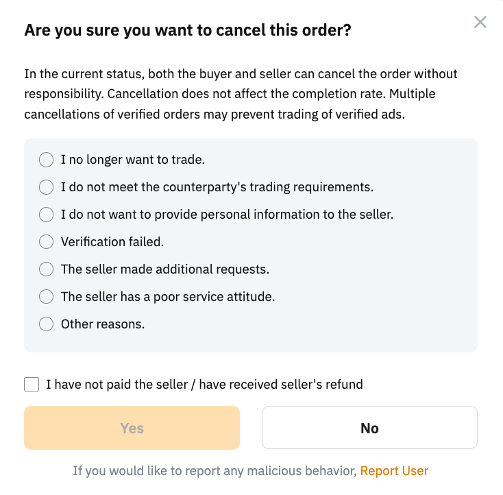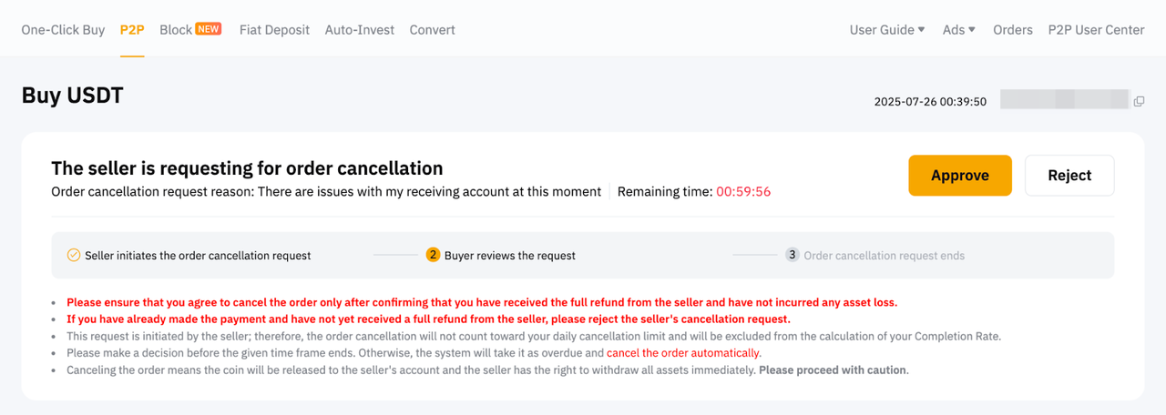 买方可在 24 小时内取消最多 3 次 P2P 订单。如果取消原因是由于买方问题,一旦达到取消限制,P2P 交易功能将限制 24 小时。