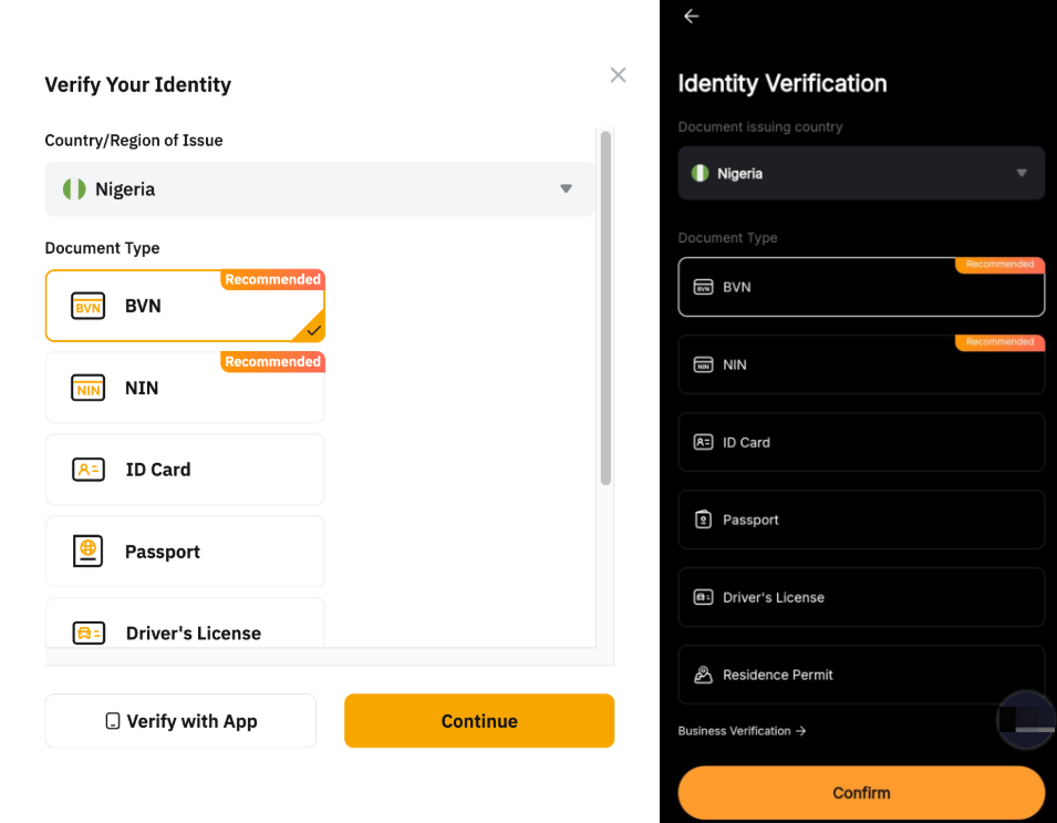 尼日利亚居民支持两 (2) 种本地证件认证类型:银行验证码 (BVN) 和身份证号 (NIN)。
