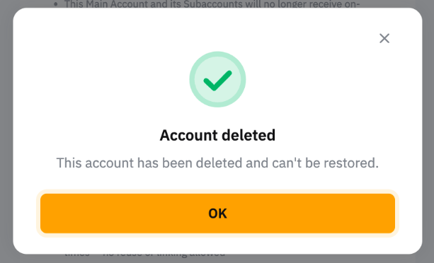 — 您的账户删除后,您所有的个人数据、保存的偏好、相关内容、现有奖励以及与账户关联的任何剩余资产都将永久删除。但是,出于法律、监管或运营目的,某些数据仍可能会保留在我们的服务器上。此操作不可撤销,所有相关数据均无法恢复。