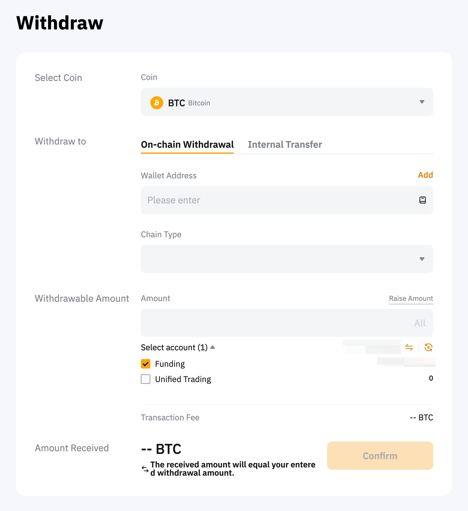 注:您的资金需要先存入您的资金账户,才能提取至您的钱包。