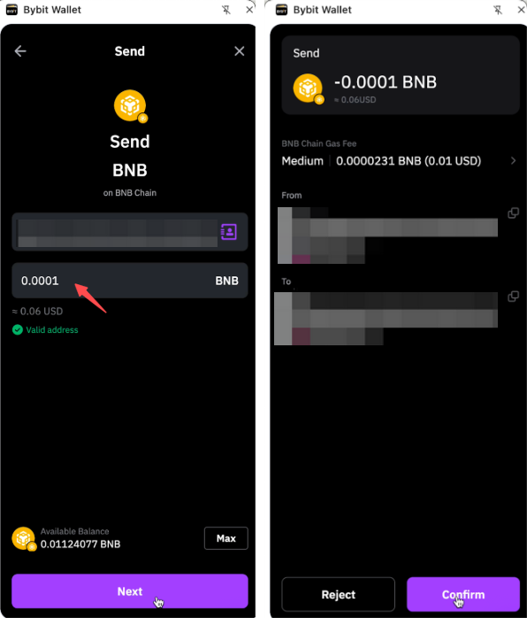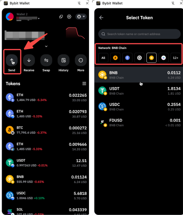 第 3 步: 点击发送,将您的钱包地址粘贴到输入框中。请确保您选择了 BSC,否则您的 USDT 和 BNB 可能无法成功划转。