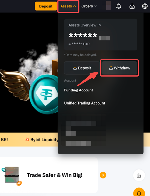 第 1 步:将光标悬停在 Bybit 页面右上角的资产上,然后选择提现