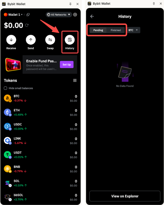 在 Bybit 钱包上点击历史记录,在处理中和完成选项卡下查看充值和提币记录。