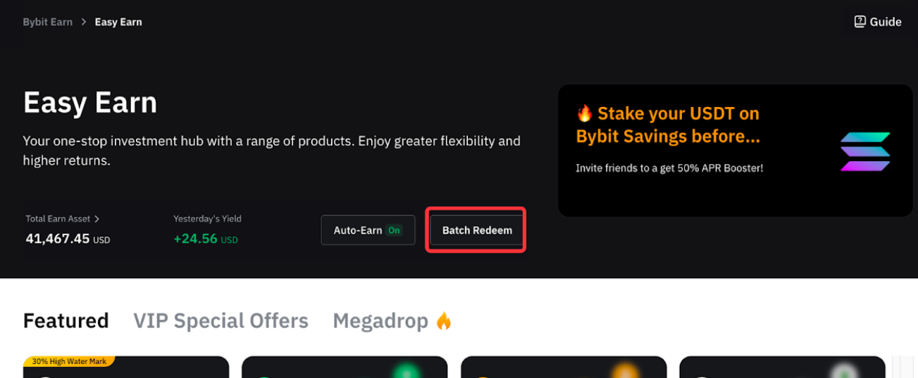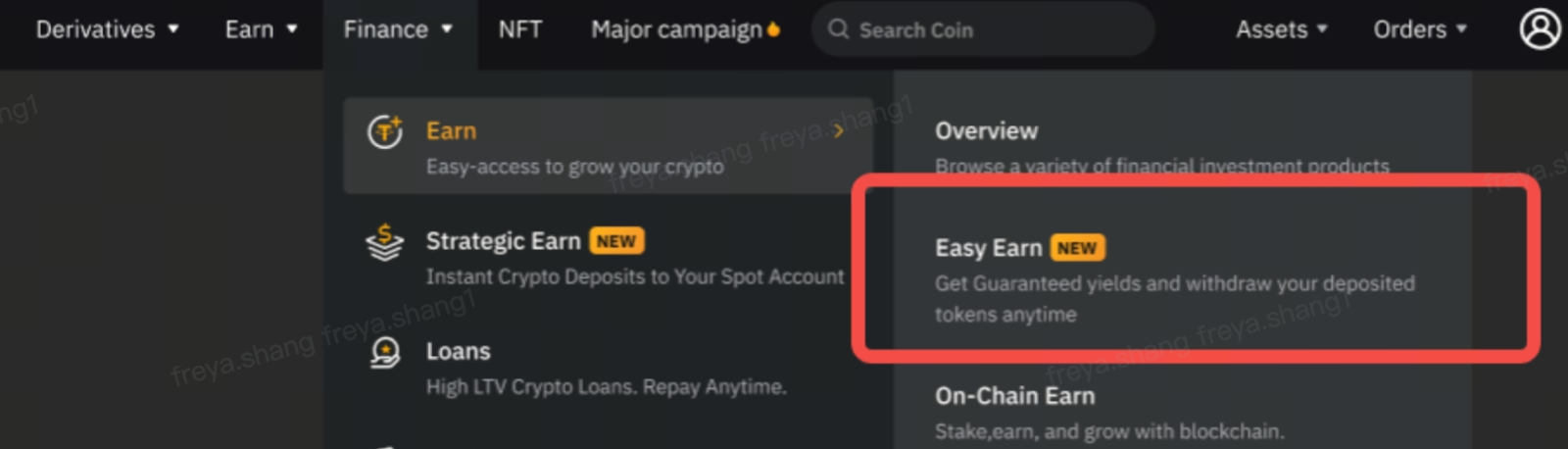 第 1 步:登录 Bybit 账户,依次点击导航栏中的金融 → 理财 → 轻松理财。