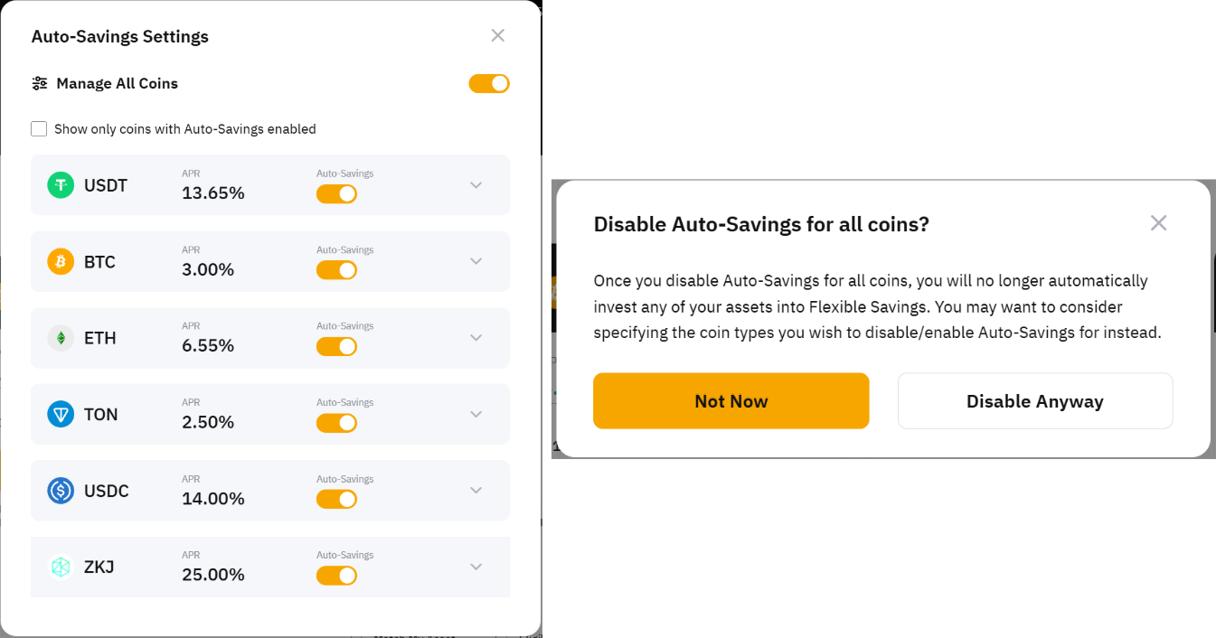 第 3 步:点击确认。系统将跳转至自动理财设置页面。管理所有币种功能默认开启。您可在此页面针对每个支持的币种单独开通或关闭自动理财功能。