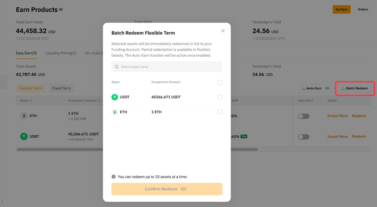 第 3 步:核对信息后,点击确认赎回完成操作。您也可以使用批量赎回按钮,一次性赎回最多 10 种资产。