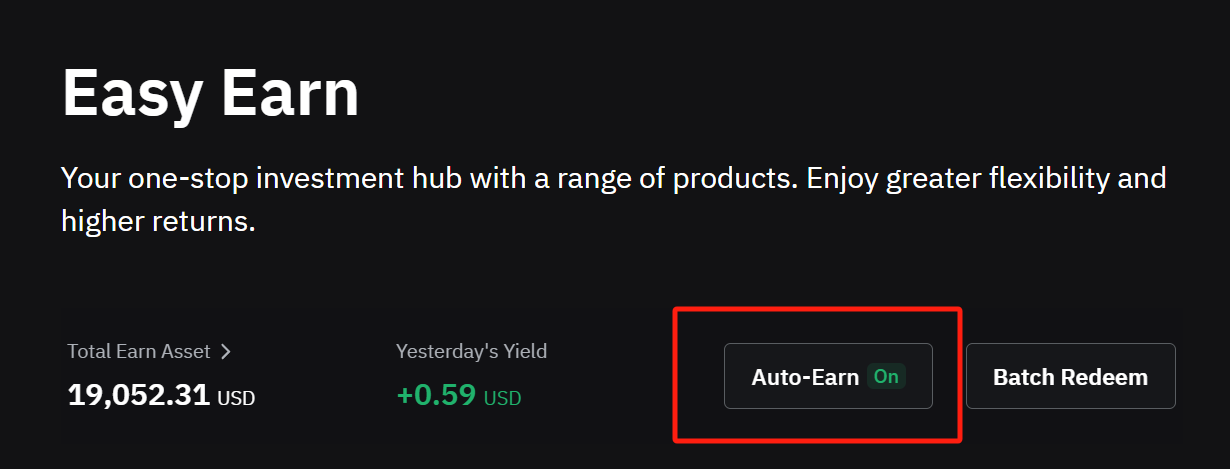 自动理财功能可将您资金账户中的闲置资产用于自动申购活期轻松理财产品。开通此功能后,您指定币种的闲置资产将于每日 10:00 (UTC) 自动投入活期轻松理财。